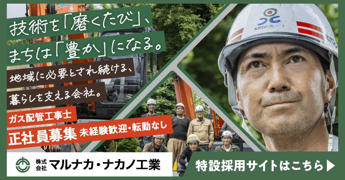 | 募集職種 | ①土木作業員(資材運搬作業/土砂・砕石の堀削埋戻し作業) ②ガス配管工(配管寸法取り、接続作業) ③重機オペレーター(ガス・土木工事現場での機械掘削作業) ④ダンプドライバー(残土・骨材・舗装の運搬作業) ⑤土木技術社員(積算・施工計画・現場施工管理) |